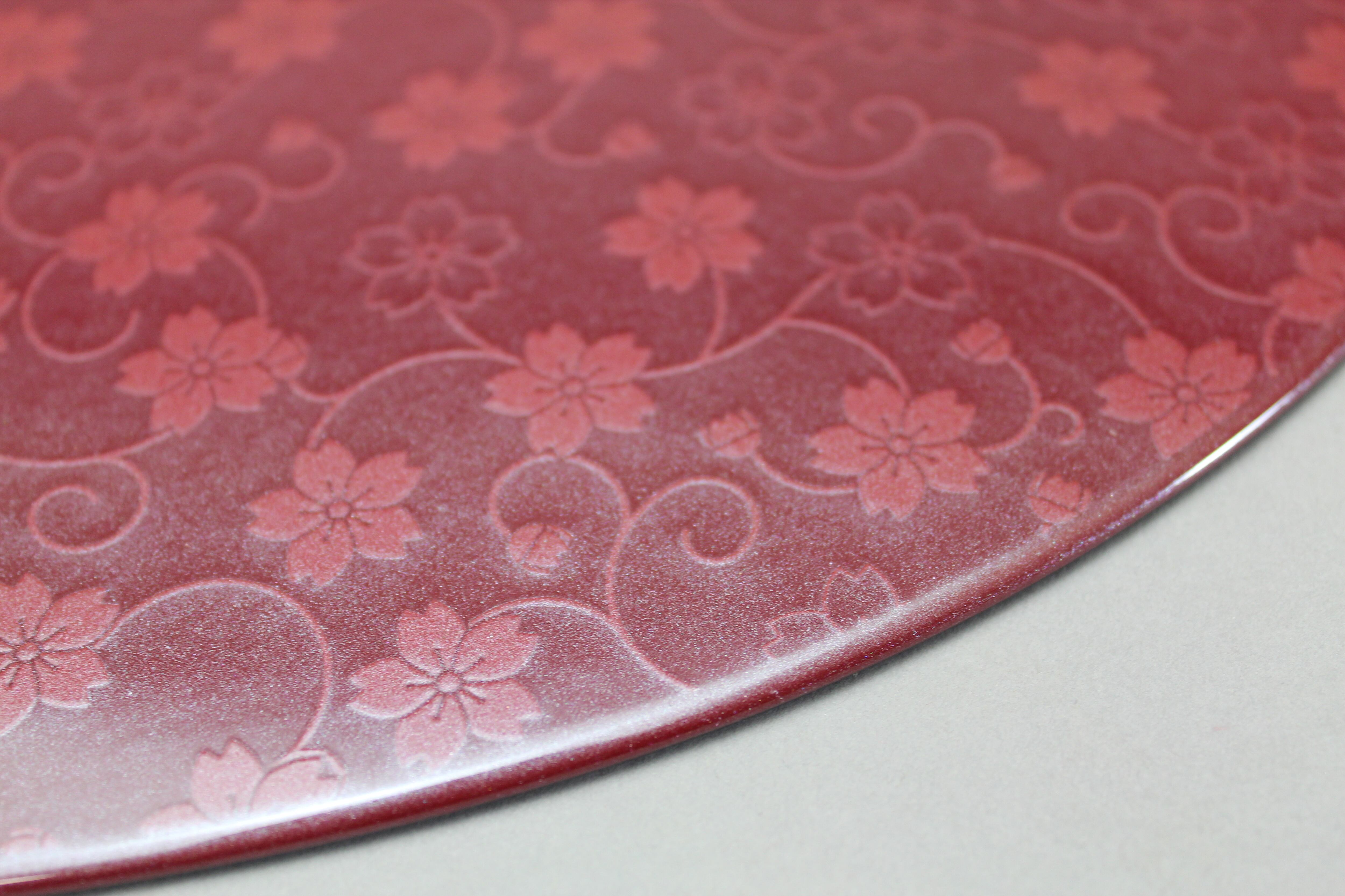 一番ポピュラーな楕円形で、表はパールトーンの赤でベースに桜唐草模様が全体に描かれています。裏は乾漆調のシックな黒で、和洋どちらにも合うリバーシブルなマットです。
