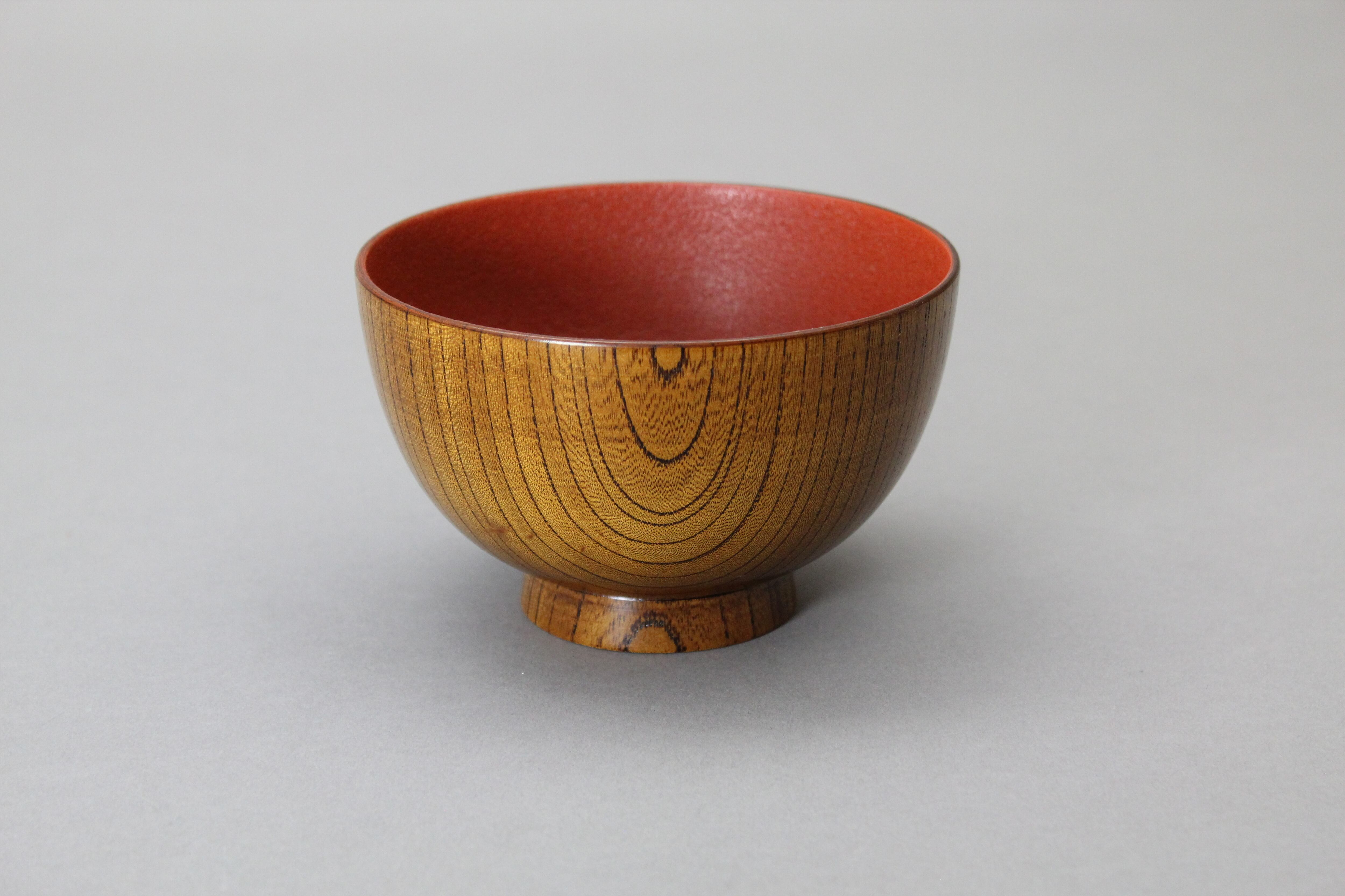 内側に丈夫さを保つために地の粉を蒔き、その上に朱漆を塗った欅杢目の美しい